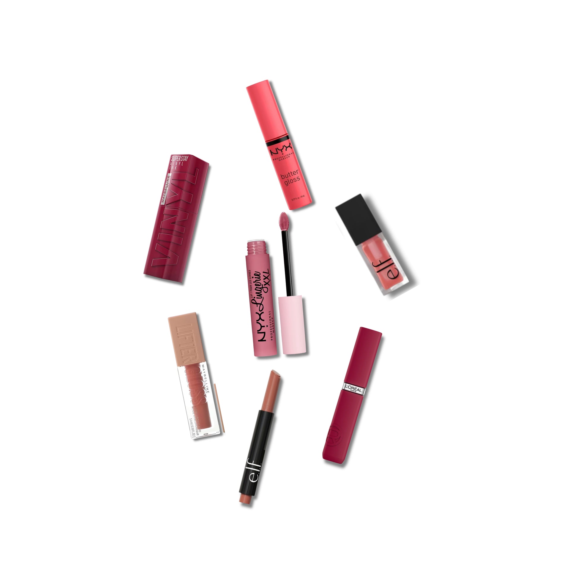 🔹 Una mezcla increíble de labiales, gloss y tintas en tonos variados y al azar (no se escoge) incluye marcas como NYX, ELF, L’Oréal, Maybelline, Milani y más.